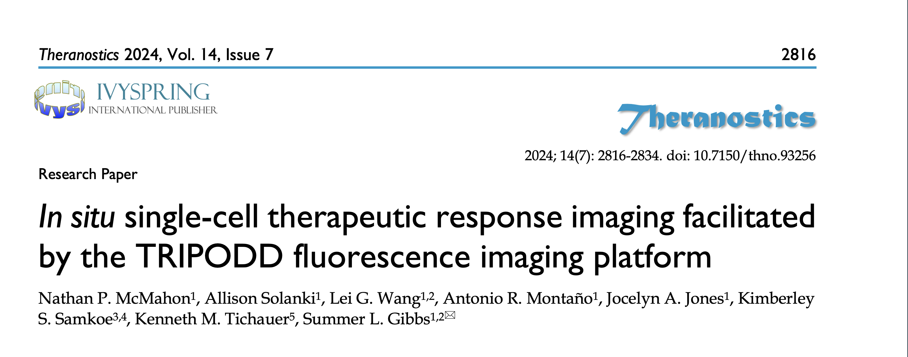 Jun 2024 - Dr. McMahon's paper, 'In situ single-cell therapeutic response imaging facilitated by the TRIPODD fluorescence imaging platform,' is featured on the cover of Theranostics.