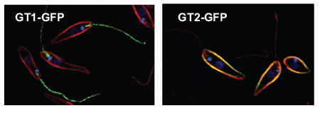 Flagella play central roles in the biology of Leishmania and African trypanosomes. They are responsible for parasite motility, but they also serve as antenna to sense the environment, as adhesive organelles to allow attachment of the parasite to both epithelia of the insect vector and the vacuolar membranes of mammalian macrophages, as secretory organelles, and as attachment sites for parasite mating. The surface membrane of the flagellum is critical for these specialized functions, so it is not surprising that the flagellar membrane is unique, containing proteins that target selectively to this membrane where they serve diverse functions. One example is shown in Figure 3. The GT1 glucose transporter (tagged with the green fluorescent protein GFP) targets specifically to the Leishmania flagellum, whereas a closely related glucose transporter GT2 is excluded from the flagellum and traffics to the membrane surrounding the cell body. GT1 appears to serve a role in sensing extracellular glucose, whereas GT2 is the principal transporter for uptake of the nutrient glucose into the parasite. Major objectives of our laboratory are to 1) dissect the molecular mechanisms these parasites use to selectively target specific proteins to the flagellar membrane where they carry out their dedicated functions, and 2) understand the functions of flagellar membrane proteins in the biology of the parasite.