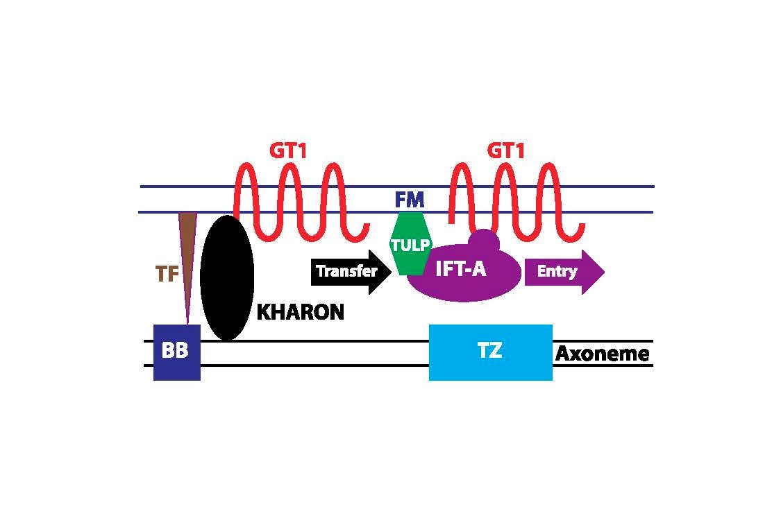 For GT1, we have identified a novel protein, called KHARON, that interacts with this transporter and is essential for its trafficking to the flagellar membrane. Studies on KHARON have demonstrated that it binds to the flagellar cytoskeleton (the tubulin-based axoneme) at the base of the flagellum and thus brings GT1 into this initial domain of the flagellum. Recent work indicates that KHARON then transfers GT1 onto Intraflagellar Transport (IFT) particles, multiprotein complexes that move GT1 into the flagellar membrane using the motor proteins, such as kinesin, that are associated with IFT particles (Figure 4). Further work on this novel flagellar trafficking mechanism is underway. .