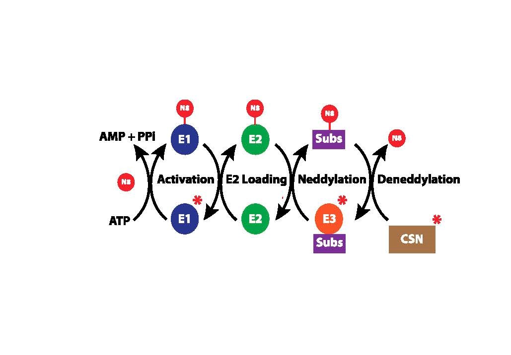 A major discovery in biology was that the small (76 amino acid) protein ubiquitin could be covalently attached to specific lysine residues on many cellular proteins and could thus modify their activities. A principal, albeit not exclusive, function of ubiquitination is to target the modified proteins for proteolytic degradation, thus determining which proteins are stable and which are removed from cells under various physiological conditions. Intriguingly, the ubiquitin modification pathway itself is subject to regulation by a process in which another ubiquitin-related protein, NEDD8, is covalently attached to one subunit (the cullin protein) of the so-called E3 ubiquitin ligase enzymes that attach ubiquitin to its substrate proteins. Once NEDD8 is attached to a cullin, the E3 enzyme is activated to ubiquitinate its substrates, and thus neddylation (the covalent attachment of NEDD8 to proteins) ultimately controls the composition of the cellular proteome. Hence, a major area of study is the neddylation pathway, which itself contains 3 enzymes, E1, E2, and E3, that activate NEDD8 and ultimately attach it to cullins (Figure 5). Neddylation is of major biomedical importance, as overactive neddylation is a dysregulation associated with many cancers, and inhibiting the overactive neddylation pathway is being pursued actively for anti-cancer therapies.