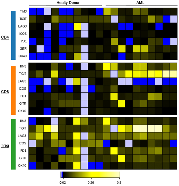 Acutemyeloid leukemia (AML) is the most common hematologic malignancy in adults, and only 25% of patients are alive at 5 years. Our lab uses both patient samples and mouse models of AML to study the effect of AML on the immune system. Of particular interest to our lab is to study the mechanism of action of combined targeted drug and immune therapies on hematological malignancies with a focus on AML. We make extensive use of mass-spec based flow cytometry (aka CyTOF) to develop a “road map” of the cell types and functional status of cells in the bone marrow and blood of leukemia patients.