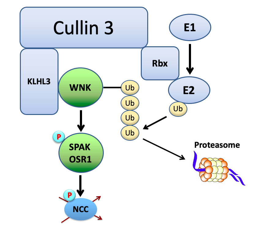 High blood pressure (hypertension) affects over 1 billion people worldwide and is estimated to cause 7.5 million deaths annually. In most cases, the cause of hypertension is unknown, but rare forms caused by mutations in specific genes have also been identified. One such disease is Familial Hyperkalemic Hypertension (FHHt). Studying the mutated genes has led to the identification of a complex pathway that controls activity of a salt transporter (NCC) in the kidney. Our lab focuses on the the CUL3/KLHL3-WNK-SPAK/OSR1 pathway as a target for antihypertensive therapy. The disease familial hyperkalemic hypertension is caused by mutations in with-no-lysine (WNK) kinases 1 and 4 and in cullin-3 and kelch-like 3, components of an E3 ubiquitin ligase complex that promotes WNK kinase degradation. The study of the mechanisms by which this pathway regulates blood pressure has identified several candidates for the development of new antihypertensive agents.