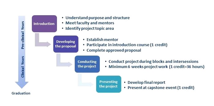 Scholarly Projects is an in-depth investigation of topics of interest to medical students during the course of their undergraduate medical education experiences with the goal of creating critical thinkers and lifelong learners. Students who complete Scholarly Projects will be able to examine complex clinical problems; expand beyond the established curriculum to investigate topics and problems in more depth; identify, define and answer important questions relevant to clinical practice and healthcare delivery; and work effectively within a learning community. Students will also understand and apply principles of professionalism, ethics, communication and collaboration while pursuing their projects.