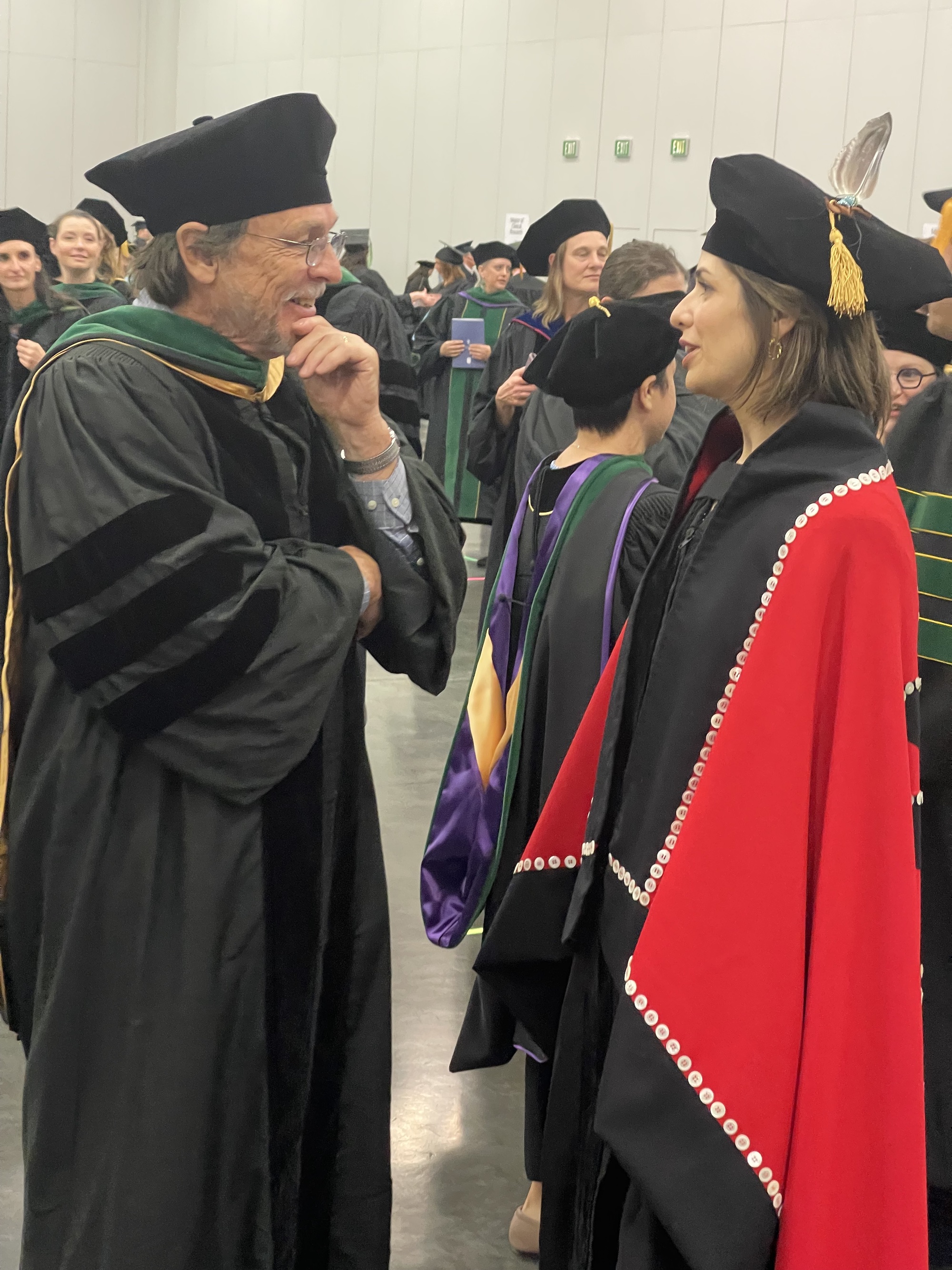 DMICE Professor Dr. Paul Gorman and Nichole Tyler, PhD. Dr. Tyler is graduating from the MD program before moving on to a pediatrics residency. Dr. Gorman was Dr. Tyler's academic coach in the MD program before she moved on to do the PhD work, " Artificial Intelligence and Physiologic Models for the Management of Type 1 Diabetes.” She is wearing an eagle feather in her cap and a beautiful red ceremonial robe, founded in her Native American roots, handmade by her and her mother. On the back they embroidered a NW Native American style graphic of an eagle protecting a baby.