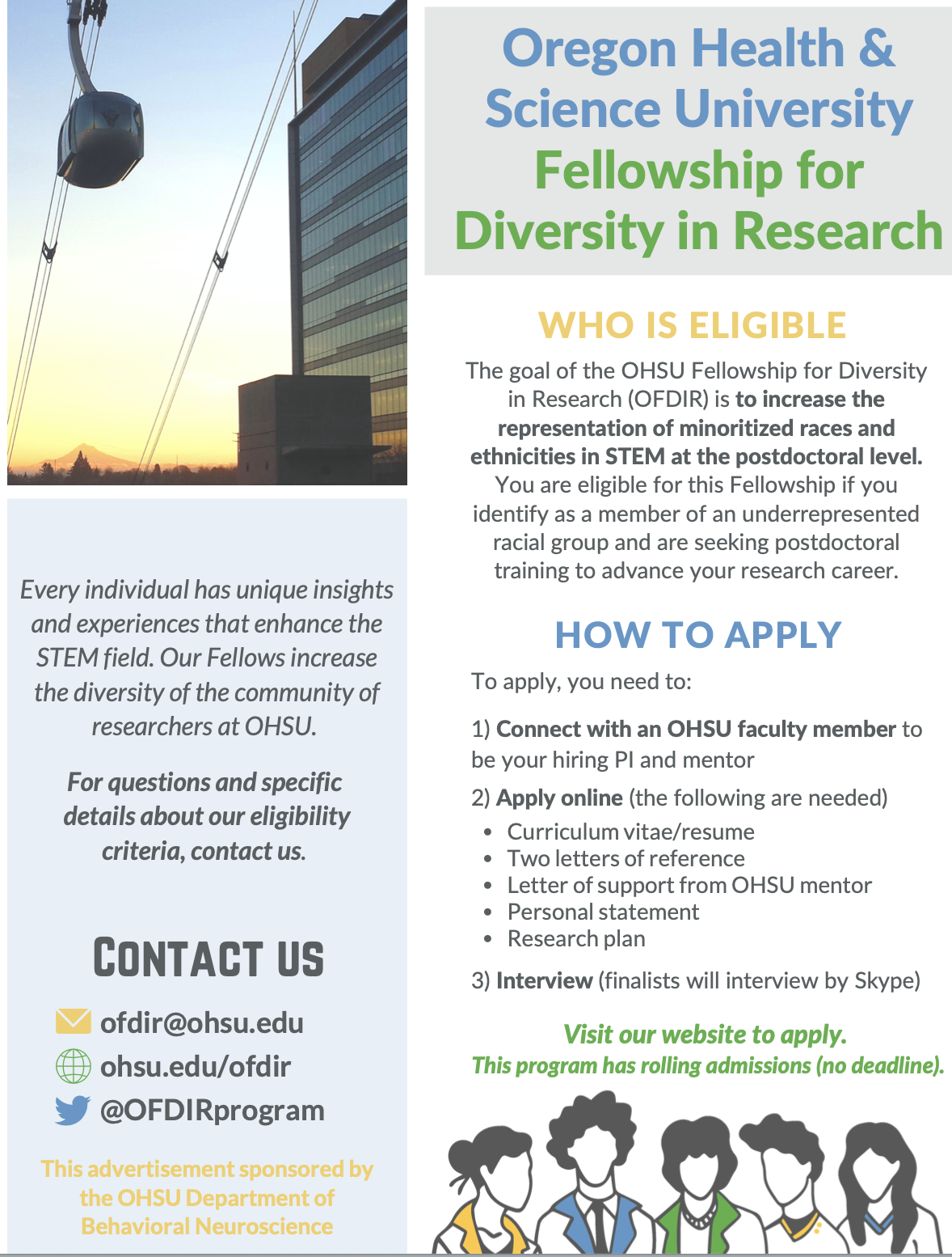 The goal of the OHSU Fellowship for Diversity in Research (OFDIR) is to address the need for increased representation of minoritized races/ethnicities in STEM at the postdoctoral level. Fellowships are available for postdoctoral training in all scientific areas of study at OHSU. OFDIR Fellows will receive mentored research training and opportunities to build community with and receive support from other scientists who identify as members of a racial or ethnic group underrepresented in STEM. Explore the link above to learn more about the benefits of the OFDIR program, how to apply, and to meet current and former OFDIR fellows."