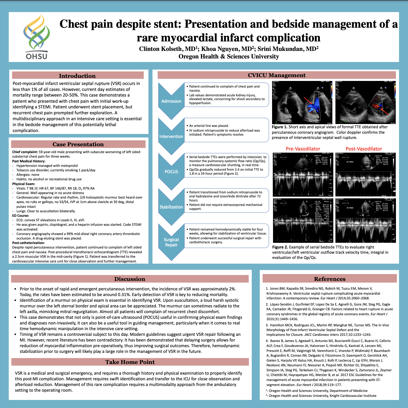 Ventricular septal rupture (VSR) is an uncommon but serious complication of myocardial infarction (MI). Proper timing for ventricular repair remains elusive, thus intensive medical management remains a key step in maintaining hemodynamics and reducing mortality.