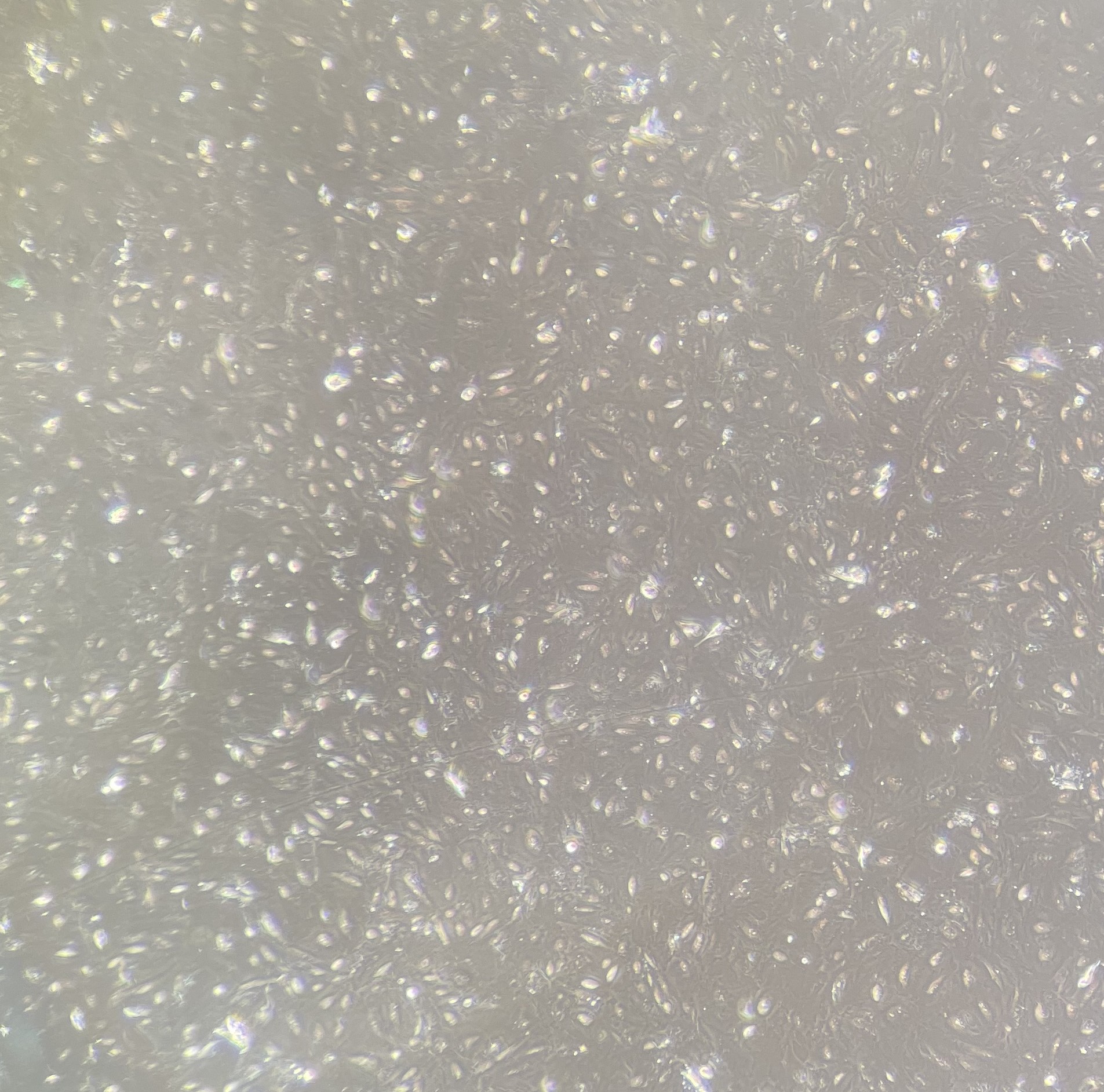This image shows cultured podocytes under a microscope. Cultured podocytes are lab-grown kidney cells used to study kidney disease.