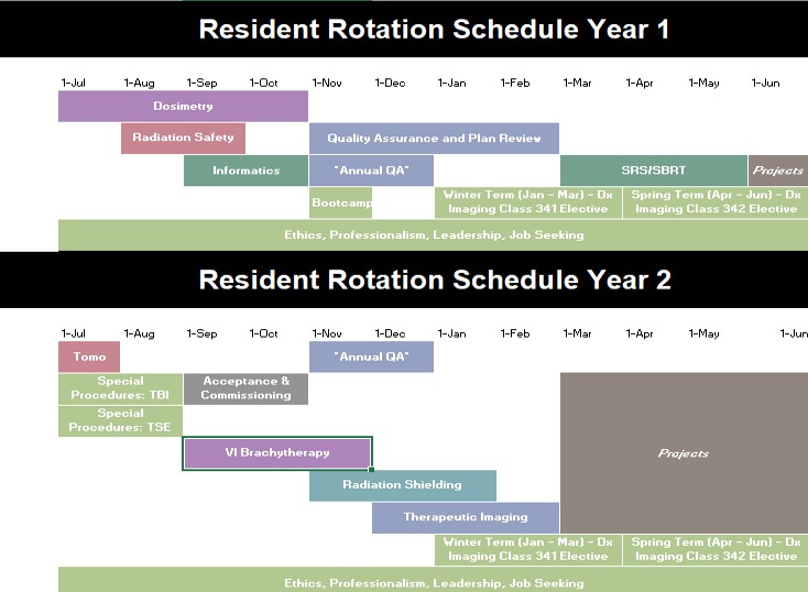 Throughout the two years of clinical training, residents gain a solid understanding of the role of patient safety in the clinical practice of medical physics, along with the technical knowledge, skills, and competencies needed for the safe and effective use of radiation therapy technologies. The curriculum blends theoretical learning, hands-on clinical experience, and professional development, helping residents build a strong foundation for board certification and independent practice.