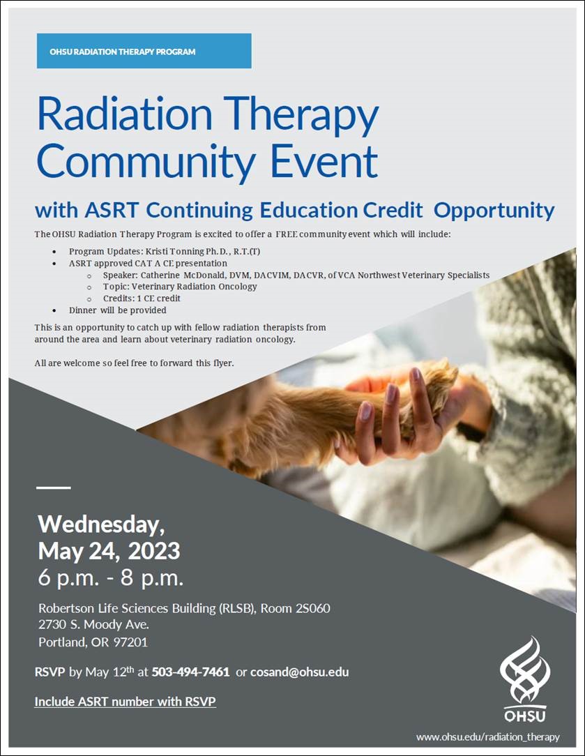 The OHSU Radiation Therapy Program would like to invite you and your RT colleagues to a FREE community event on May 24th, 2023 6-8PM at the RLSB, Portland, OR.