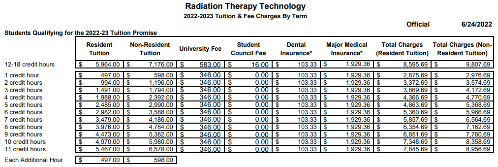 OHSU’s tuition and fee schedule is updated annually. For a detailed breakdown of Radiation Therapy Program tuition and fees, navigate to the 2025-2026 OHSU Tuition and Fees document here; Radiation Therapy Technology is listed on page 5.