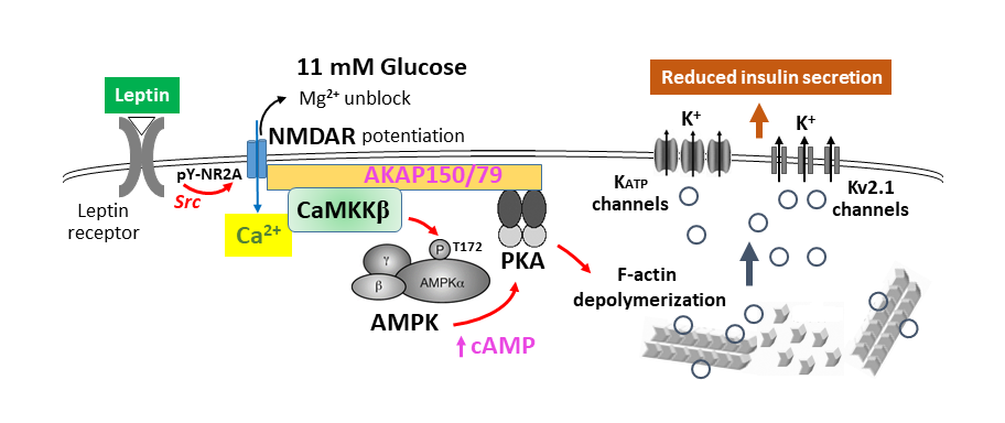 This project investigates how the adipocyte-derived hormone leptin regulates the trafficking of KATP channels in pancreatic β-cells to control insulin secretion and glucose homeostasis. Using biochemical, electrophysiology, biosensor-based live cell imaging, phosphoproteomic and BioID approaches, we are exploring the signaling pathway underlying the effect of leptin, in particular the role of NMDA receptors in mediating the effect of leptin to activate the downstream molecule AMPK, and how AMPK activation leads to PKA activation and actin reorganization to promote channel trafficking to the cell surface.