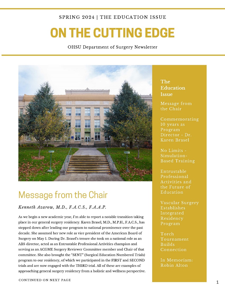 The leadership of our physicians and scientists can be captured in three words: imagination, excellence, and focus. As a result of this chemistry, many revolutionary advances in medicine and surgery have started at OHSU, including the first mechanical heart valve, the first percutaneous angioplasty and coronary arteriography with specialized catheters, the first balloon embolectomy catheter, the first kidney transplant in an adolescent, the first use of imatinib for myelocytic leukemia and gastrointestinal stromal tumors, and the first totally endoscopic esophagogastric fundoplication. Many of these innovations commenced in the Department of Surgery. Keep reading