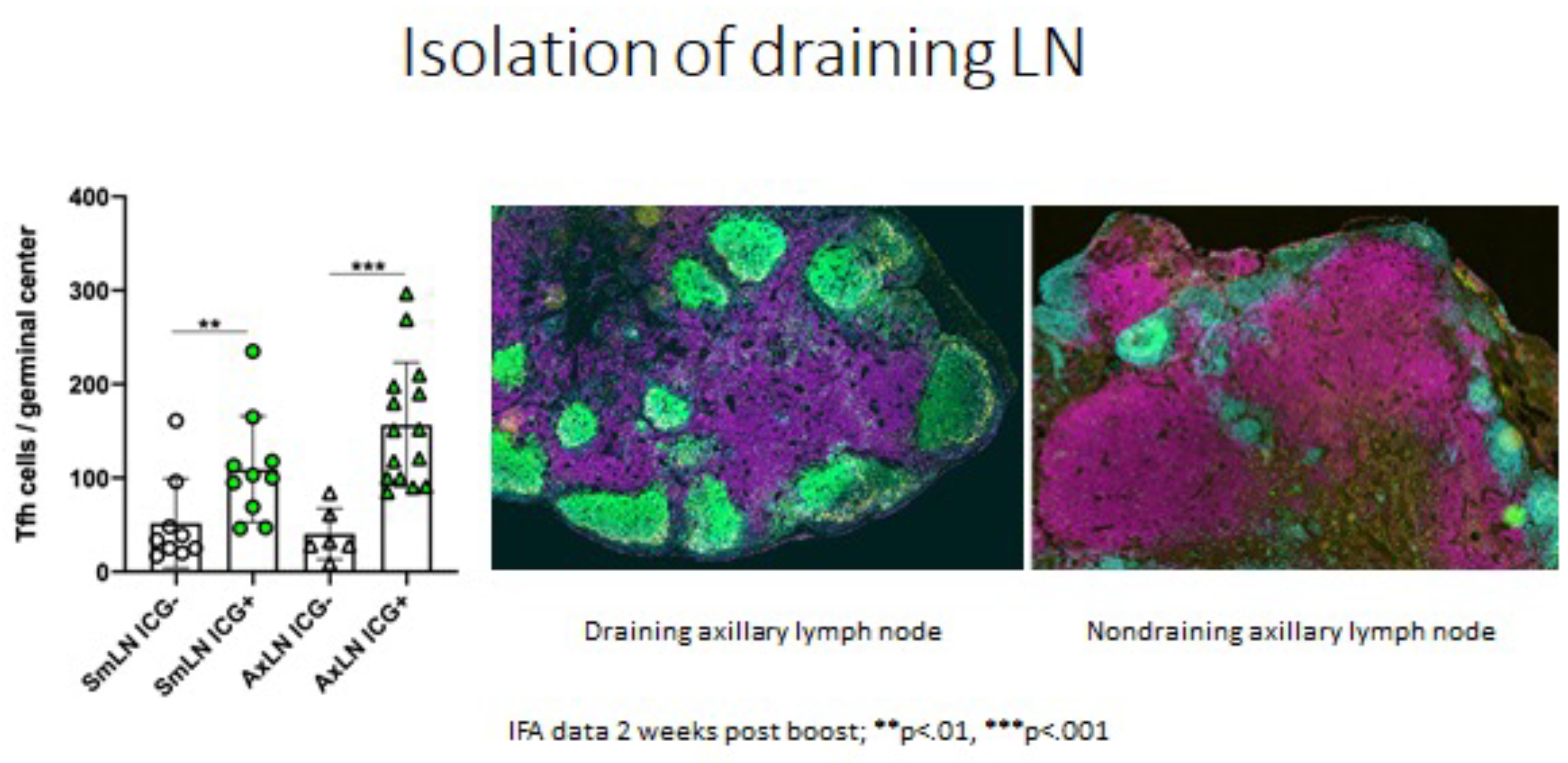 The importance of guided sampling can be seen below with identification of the axillary or submandibular LN draining the site of vaccination vs an adjacent LN collected from the same site on the same animal. The draining node exposed to the vaccine immunogen has more T follicular helper cells indicating that it is responding to the vaccine.