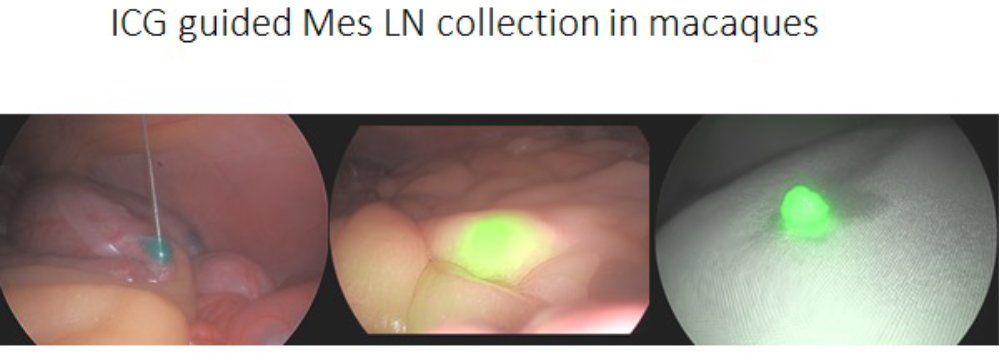 We have the same ability to perform guided LN sampling for abdominal LNs as well. In the example below mesenteric LN draining a specific location in the colon are identified.