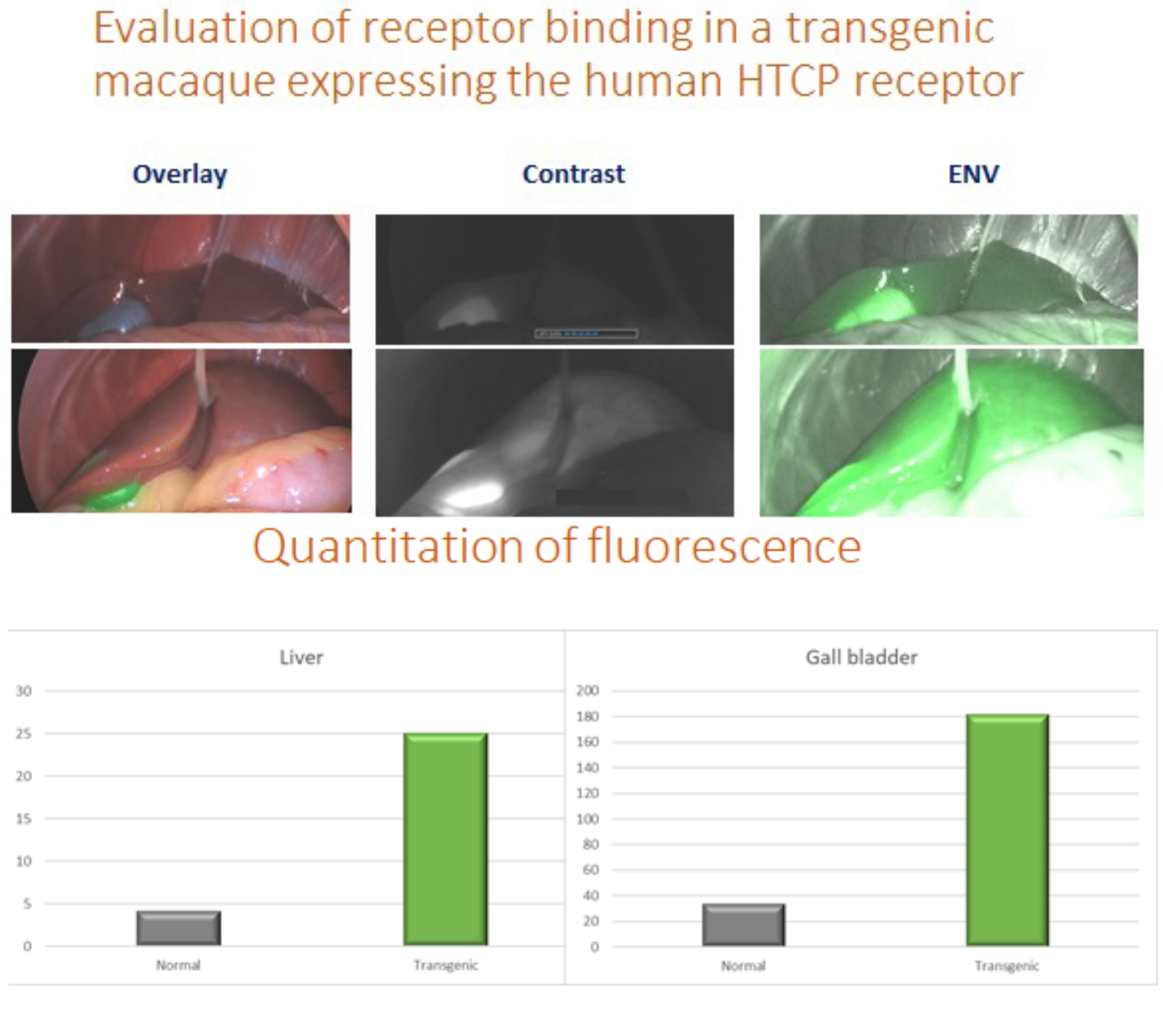 We can also evaluate and quantitate the amount of fluorescence from our NIR imaging platform. Below is an example from our Hepititis B model looking at binding of ICG labeled MYR-B that binds to the human NTCP receptor used by Hep B to enter cells. The top animal is a typical rhesus that lacks the HCTP receptor and the bottom animal is a transgenic with the fully functional HCTP receptor making it susceptible to Hep B infection. The distribution and density of the receptor can be quantitated by image analysis.