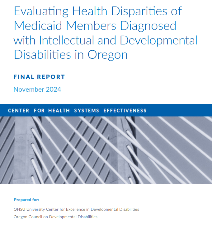 The UCEDD collaborated with the OHSU Center for Health Systems Effectiveness Research (CHSE) on a research study looking at health disparities in the adult IDD population in Oregon that used Medicaid claims data in 2022. The findings were used to develop policy and research recommendations as a call to action for the public health workforce.