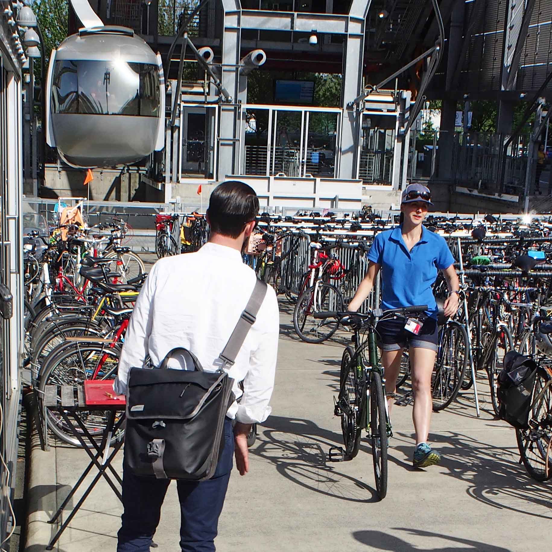 A free service open to anyone, simply stop by Go By Bike at the Portland Aerial Tram's lower terminal. You don't need to bring a lock or take any accessories off your bike. Go By Bike has partnered with OHSU and the Tram and safely returned bikes hundreds of thousands of times.