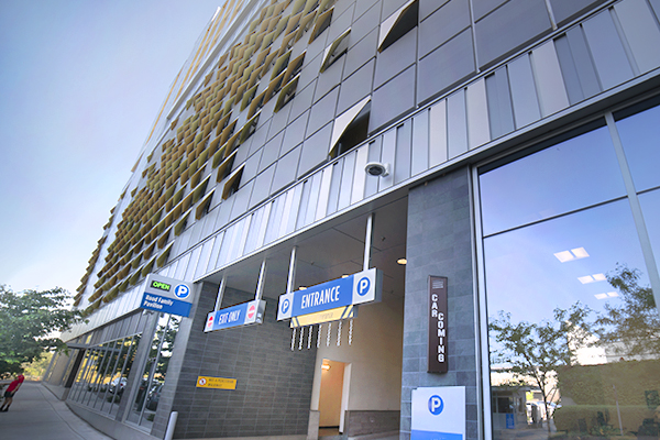 The garage entrance is located on the north side of Rood Family Pavilion on S Whitaker Ave between S Bond Ave and S River Pkwy.
