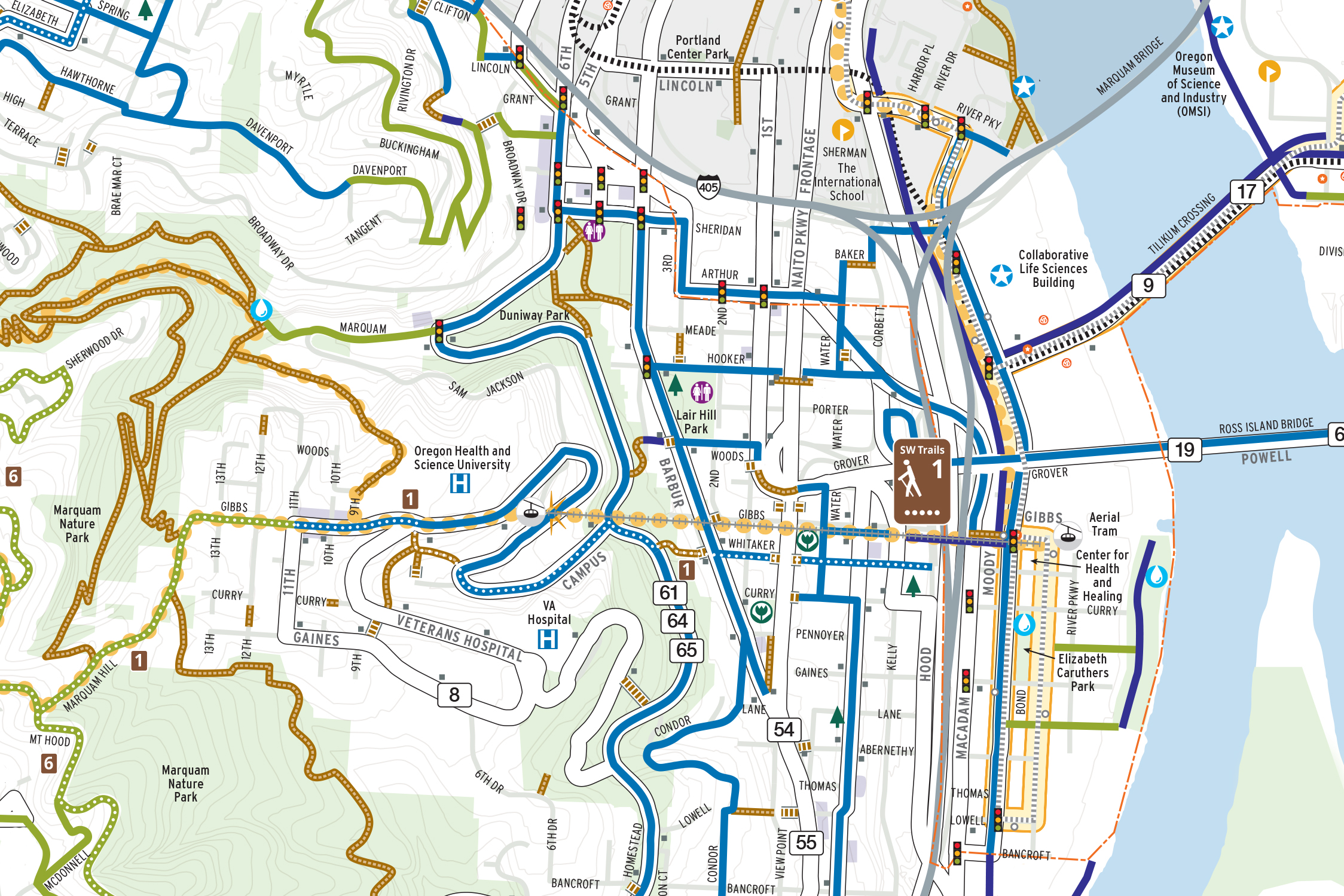 - Marquam Hill is most easily accessed via Terwilliger Boulevard which has sidewalks and trail heads.