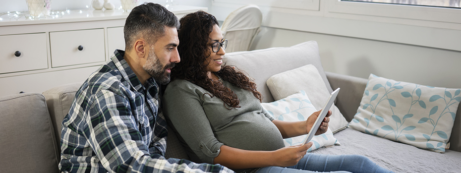 An expecting couple sits together on a couch, attending a virtual childbirth class on their tablet.